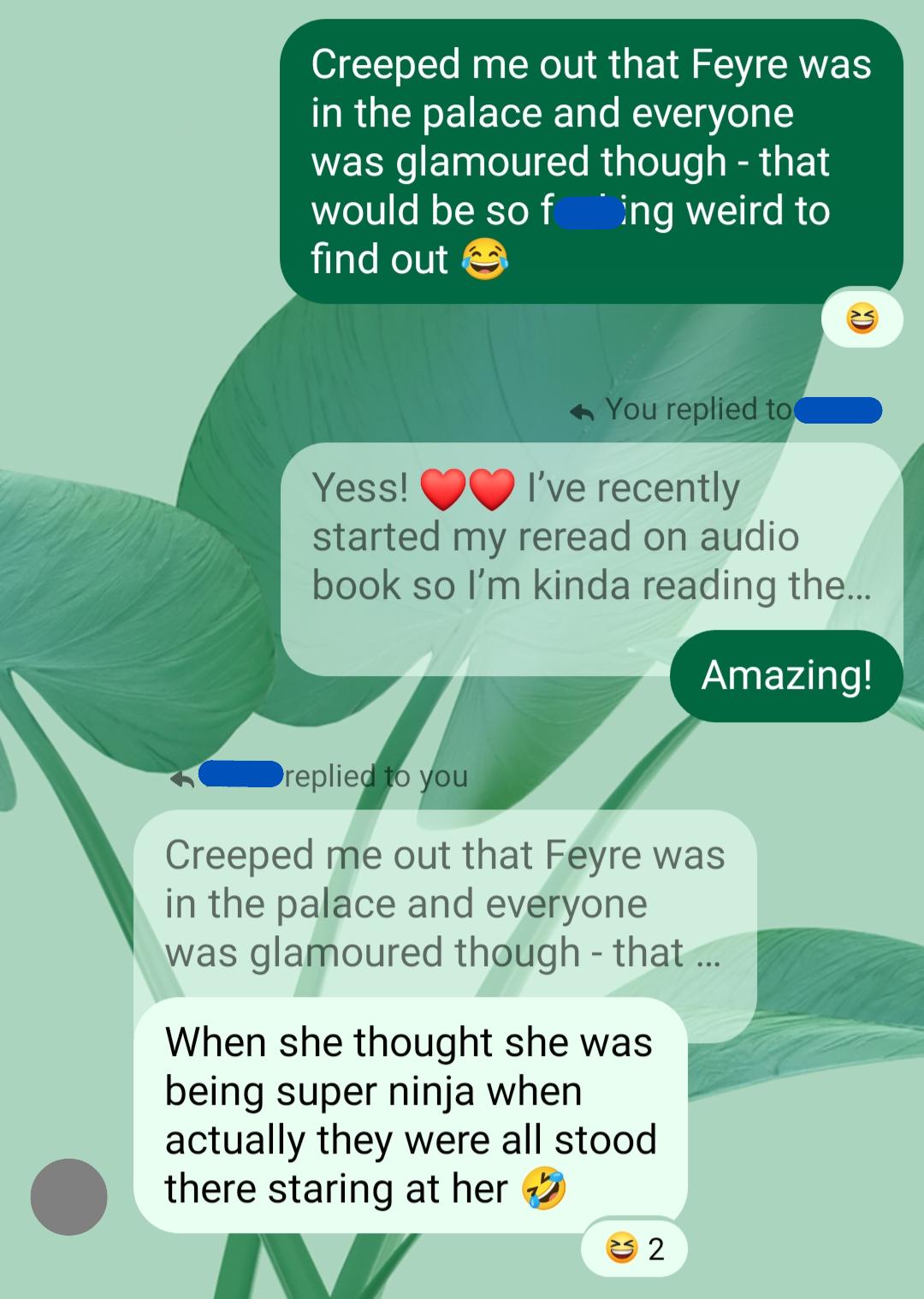 One of my favourite visuals through the whole book, was finding out that there have been Fae all around Feyre the whole time – but they were glamoured to her. Whilst I think it would be horrifically invasive thing to find out, in her position, the mental image of her ‘sneaking around’ whilst surrounded by people really tickled me!