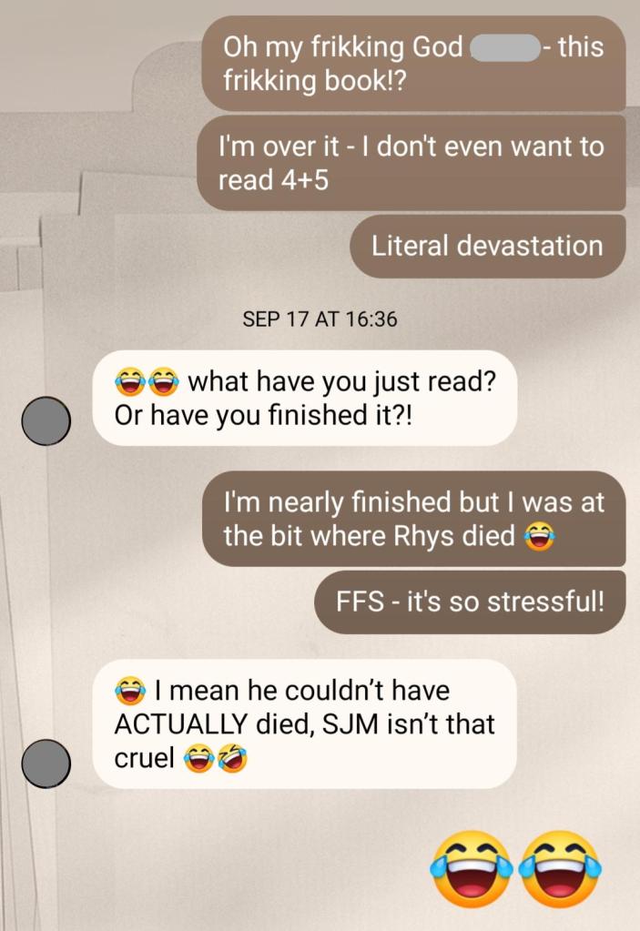 I’m sure if you’re here, you’ve already read the ACOTAR series, but I’ll put a brief summary of each book as they come. When I was reading this series I made notes at the end of each books, as well as messaging the book besties as I went – you may get a wee giggle out of those interactions [I apologise for any offensive language].