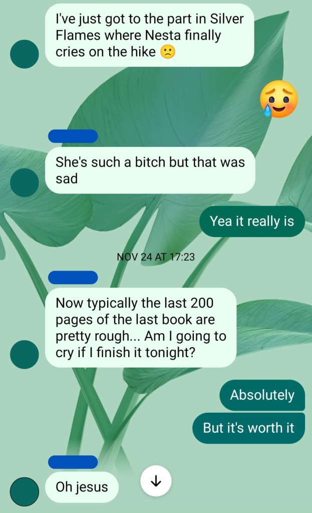 I did eventually come to really love Nesta, and to be much more understanding of the fact that her actions were a result of her grieving – but honestly, in this one, I kind of felt she just needed a kick up the backside and I wasn’t super excited to go into reading a whole book based around her. But I will admit, A Court of Silver Flames did get me rooting for Nesta.